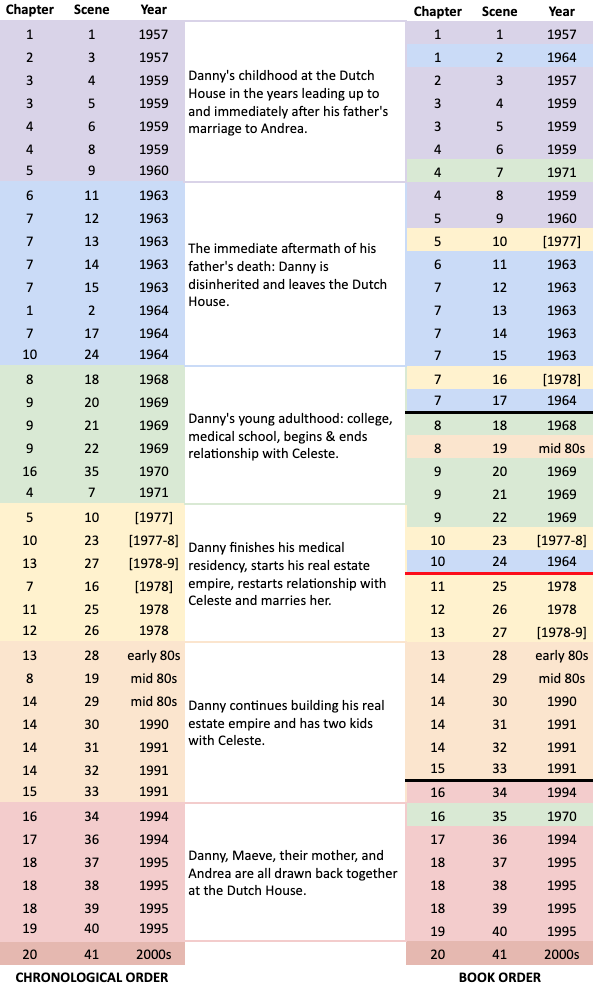 Let’s take a quick look at the chronology of the novel. The novel spans roughly fifty years, from 1957 to the early 2000s, with roughly equal periods dedicated to various epochs in Danny’s life. In the graphic below, you’ll see the chronological order on the left, with various periods marked off by color. On the right is the book order, with the two part breaks marked by black lines. (The red line is the halfway mark and also marks a pivot point in the plot I’ll discuss below.)